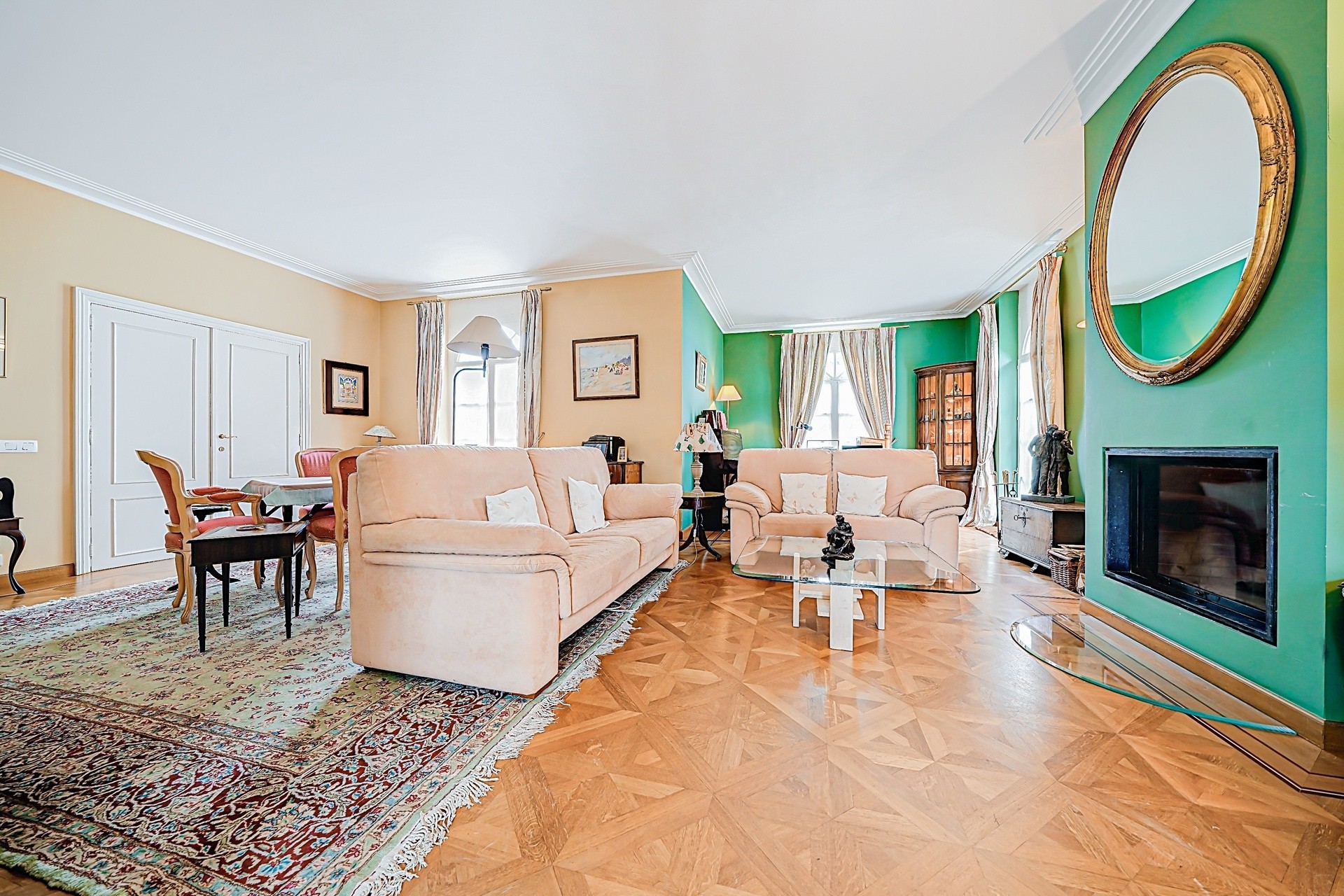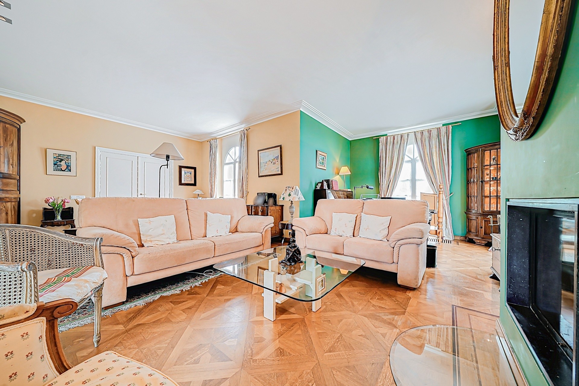 La maison se compose, au rez-de-chaussée, d’un hall d’entrée en marbre avec coin vestiaire et toilette invités avec lave-mains, d’un salon et d’une salle à manger avec feu ouvert, ainsi que d’une cuisine équipée donnant accès à la terrasse (45 m²) et au magnifique jardin avec piscine.
