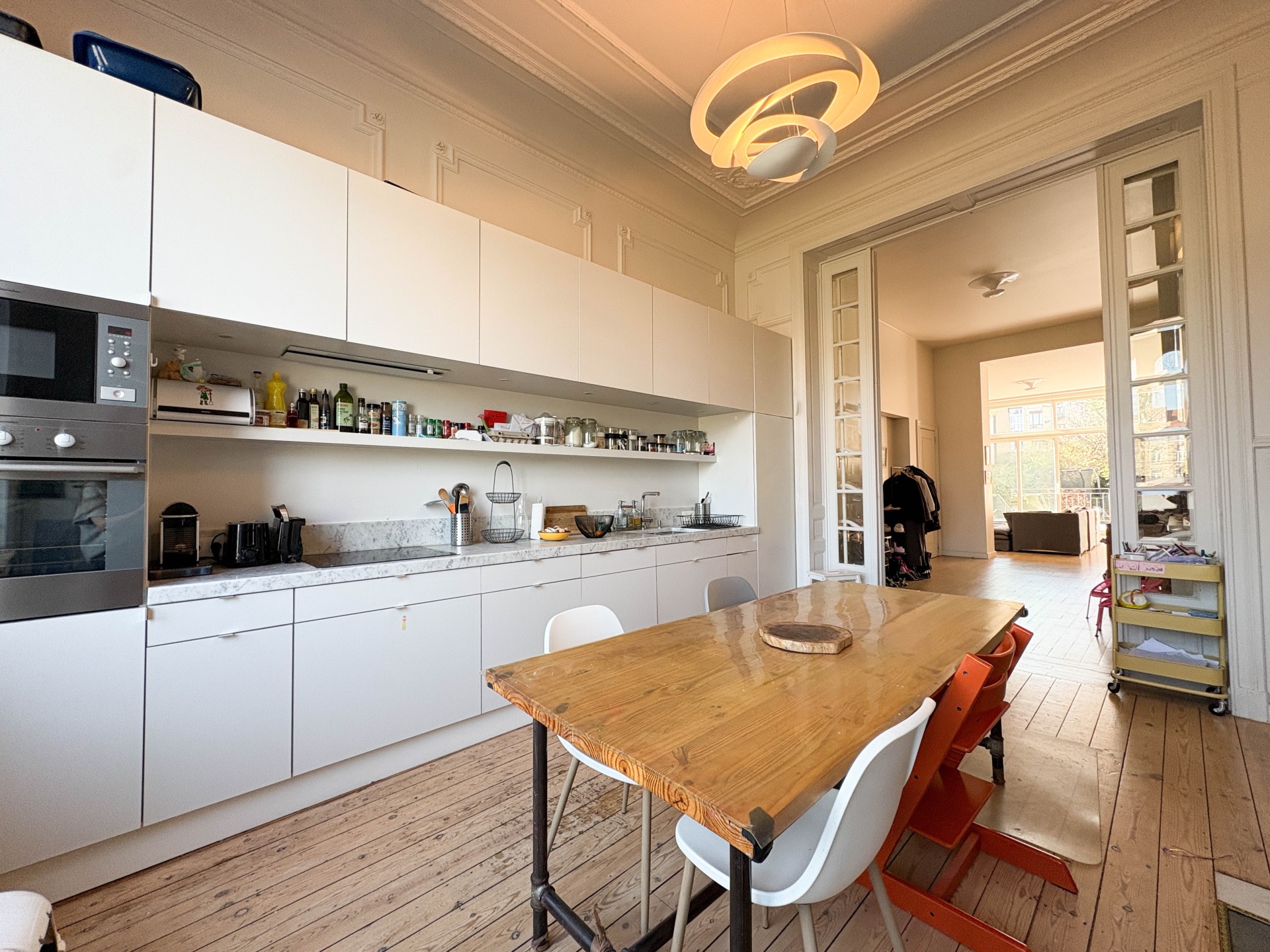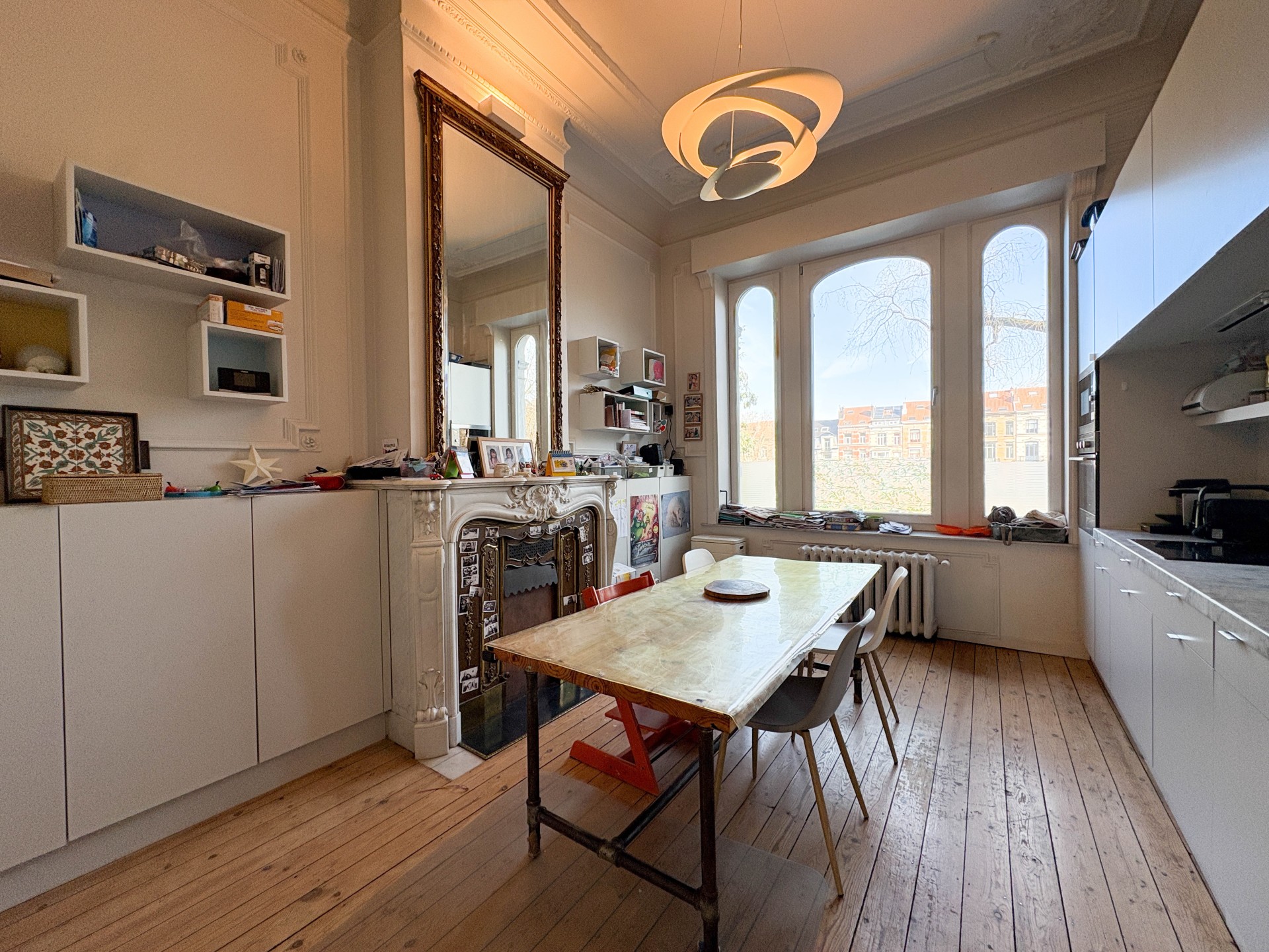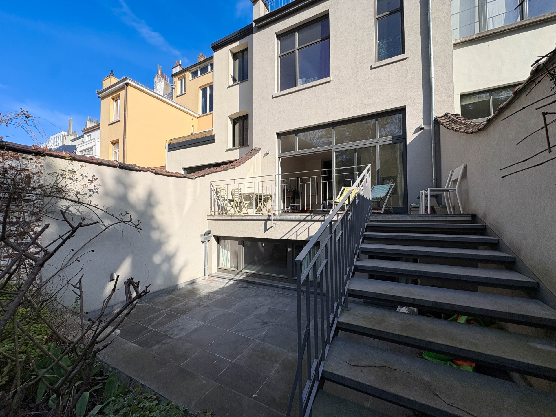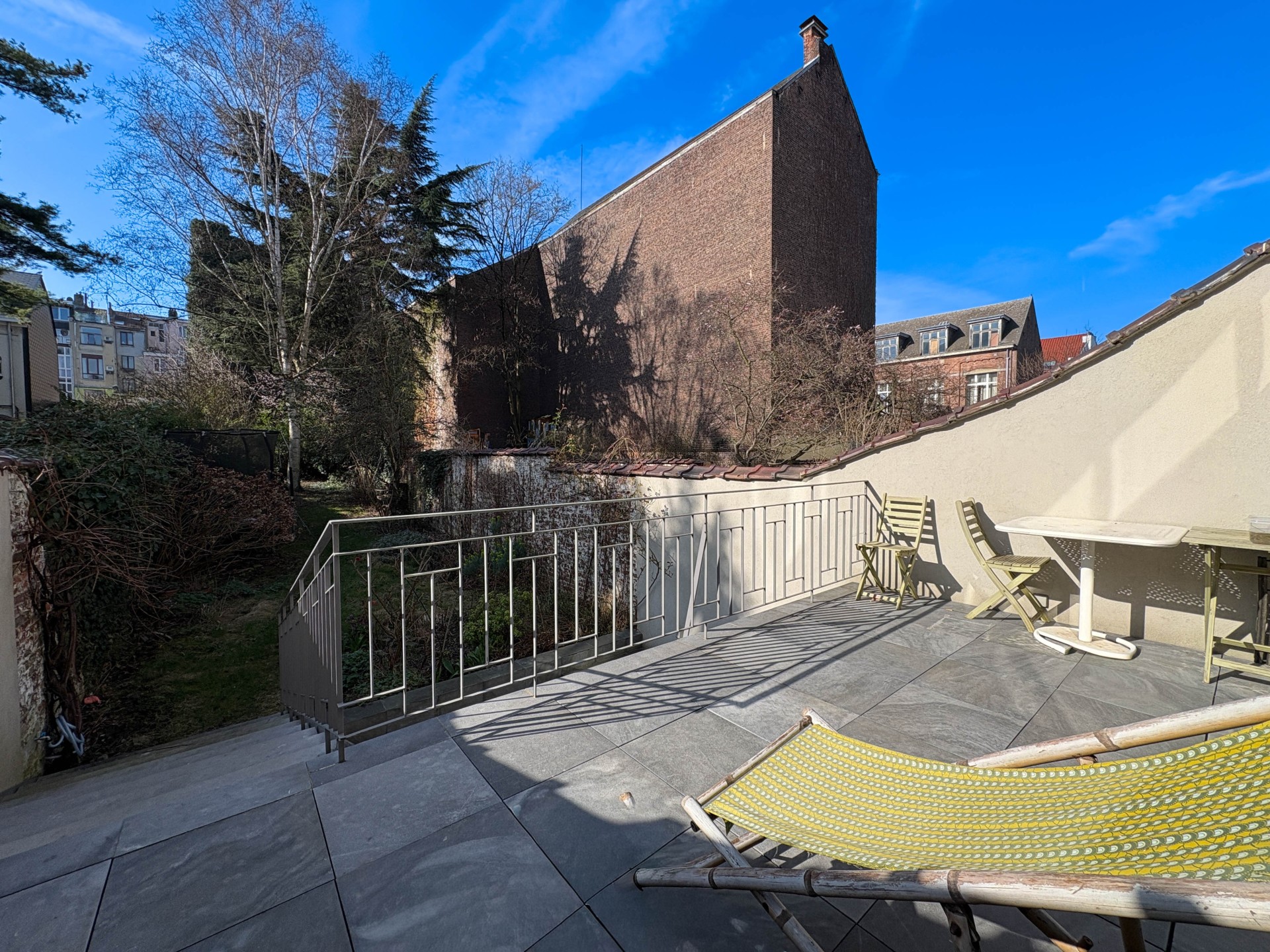 Saint-Gilles – Quartier du Parvis, dans un environnement calme et verdoyant, superbe maison de maître de caractère comprenant une belle entrée d’immeuble et un spacieux triplex d’environ 240 m², réparti sur trois niveaux, avec terrasse d’environ 20 m² et jardin privatif exceptionnel sans vis-à-vis d’environ 300 m².